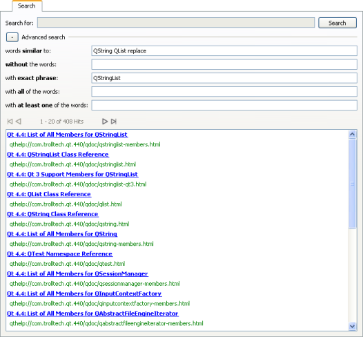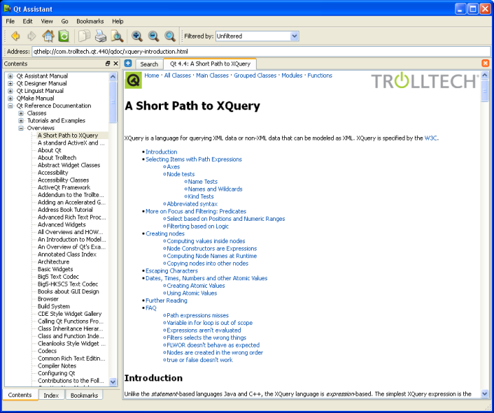 Qt Assistant allows you to install any kind of documentation as long as it is organized in Qt compressed help files (*.qch). For example, it is possible to install the Qt reference documentation for Qt 4.4.0 and Qt 4.4.1 at the same time. In many respects, this is very convenient since only one version of Qt Assistant is needed. However, at the same time it becomes more complicated when performing tasks like searching the index because nearly every keyword is defined in Qt 4.4.0 as well as in Qt 4.4.1. This means that Qt Assistant will always ask the user to choose which one should be displayed.