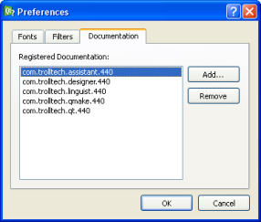 The Documentation page lets you install and remove compressed help files. Click the Install button and choose the path of the compressed help file (*.qch) you would like to install. To delete a help file, select a documentation set in the list and click Remove.
