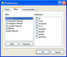 For example, the Qt 4.4.0 Qt Assistant documentation defines the attributes assistant, tools and 4.4.0, Qt Designer defines designer, tools and 4.4.0. The filter to display all tools would then define only the attribute tools since this attribute is part of both documentation sets. Adding the attribute assistant to the filter would then only show Qt Assistant documentation since the Qt Designer documentation does not contain this attribute. Having an empty list of attributes in a filter will match all documentation; i.e., it is equivalent to requesting unfiltered documentation.