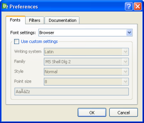 The Fonts page allows you to change the font family and font sizes of the browser window displaying the documentation or the application itself.