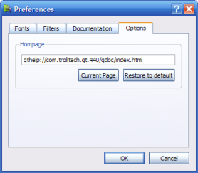 The Options page lets you specify the homepage Qt Assistant will display when you click the Home button in Qt Assistant's main user interface. You can specify the homepage by typing it here or clicking on one of the buttons below the textbox. Current Page sets the currently displayed page as your home page while Restore to default will reset your home page to the default home page.