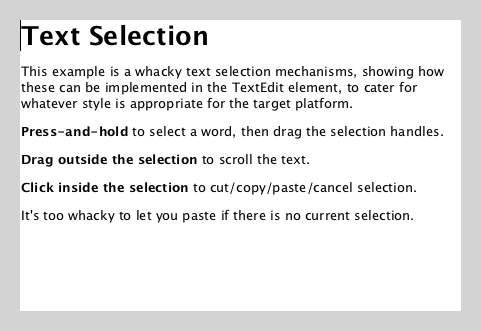 This example shows how text selection, copy and paste operations can be implemented on top of the TextEdit element.