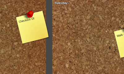 This example presents a flickable set of interactive corkboards. It is created through a combination of elements like ListModel, Repeater and TextEdit together with rotation and scaling transforms, animation and mouse interaction.