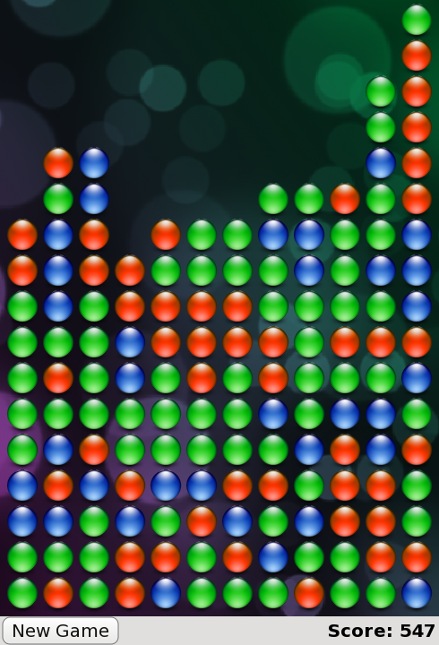The gameCanvas item is the exact size of the board, and has a score property and a MouseArea to handle mouse clicks. The blocks are now created as its children, and its dimensions are used to determine the board size so that the application scales to the available screen size. Since its size is bound to a multiple of blockSize, blockSize was moved out of samegame.js and into samegame.qml as a QML property. Note that it can still be accessed from the script.
