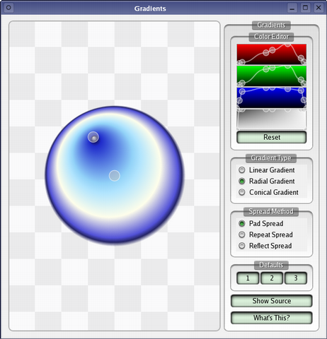 In this demo we show the various types of gradients that can be used in Qt.
