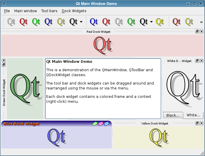 The Main Window demonstration shows Qt's extensive support for tool bars, dock windows, menus, and other standard application features.