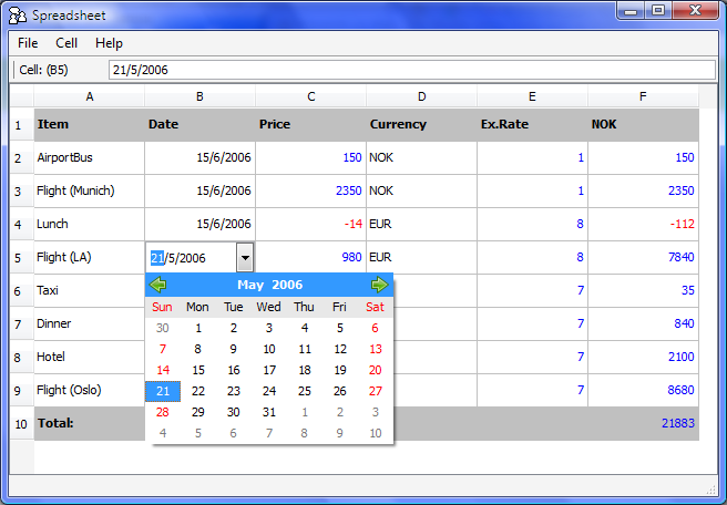 The Spreadsheet demonstration shows how a table view can be used to create a simple spreadsheet application. Custom delegates are used to render different types of data in distinctive colors.