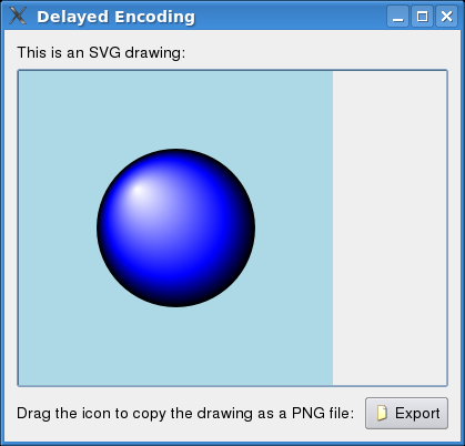 The Export push button is pressed down to start the drag. The data for the drag and drop operation is not processed until the user of the application has found a valid drop target. This removes redundant processing if the operation is aborted. In our case, we have an SVG image that we wish to send as the "image/png" MIME type. It is the conversion from SVG to PNG we wish to delay - it can be quite expensive.
