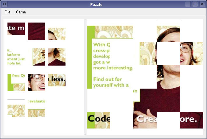 This example is an implementation of a simple jigsaw puzzle game using Qt's drag and drop API. The Item View Puzzle example shows many of the same features, but takes an alternative approach that uses Qt's model/view framework to manage drag and drop operations.