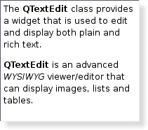 The QTextEdit class provides a widget that is used to edit and display both plain and rich text. |