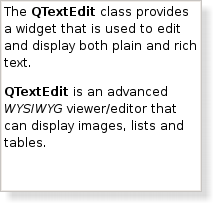 The QTextEdit class provides a widget that is used to edit and display both plain and rich text. |