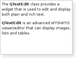 The QTextEdit class provides a widget that is used to edit and display both plain and rich text. |
