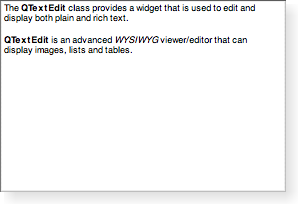The QTextEdit class provides a widget that is used to edit and display both plain and rich text. |