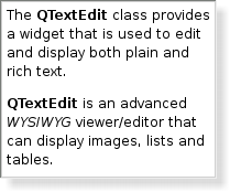 The QTextEdit class provides a widget that is used to edit and display both plain and rich text. |