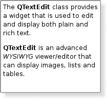 The QTextEdit class provides a widget that is used to edit and display both plain and rich text. |
