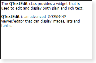 The QTextEdit class provides a widget that is used to edit and display both plain and rich text. |
