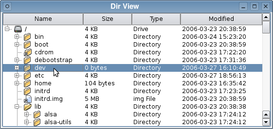 The Dir View example shows a tree view onto the local filing system. It uses the QDirModel(obsolete) class to provide supply file and directory information.