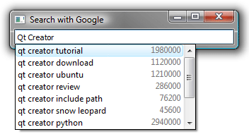 A GSuggestCompletion member provides the SearchBox with the request functionality and the suggestions returned from the Google search engine.