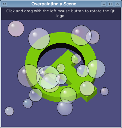 With the 3D graphics done, we construct a QPainter for use on the widget and simply overpaint the widget with 2D graphics; in this case, using a helper class to draw a number of translucent bubbles onto the widget, and calling drawInstructions() to overlay some instructions: