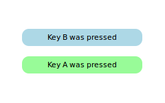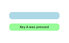 Rectangle { id: widget color: "lightsteelblue"; width: 175; height: 25; radius: 10; smooth: true Text { id: label; anchors.centerIn: parent} focus: true Keys.onPressed: { if (event.key == Qt.Key_A) label.text = 'Key A was pressed' else if (event.key == Qt.Key_B) label.text = 'Key B was pressed' else if (event.key == Qt.Key_C) label.text = 'Key C was pressed' } }
