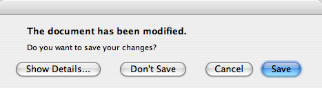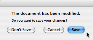 int ret = QMessageBox::warning(this, tr("My Application"), tr("The document has been modified.\n" "Do you want to save your changes?"), QMessageBox::Save | QMessageBox::Discard | QMessageBox::Cancel, QMessageBox::Save);