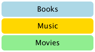 import QtQuick 1.0 Item { width: 310; height: 170 Column { anchors.horizontalCenter: parent.horizontalCenter anchors.verticalCenter: parent.verticalCenter spacing: 5 Rectangle { color: "lightblue"; radius: 10.0 width: 300; height: 50 Text { anchors.centerIn: parent font.pointSize: 24; text: "Books" } } Rectangle { color: "gold"; radius: 10.0 width: 300; height: 50 Text { anchors.centerIn: parent font.pointSize: 24; text: "Music" } } Rectangle { color: "lightgreen"; radius: 10.0 width: 300; height: 50 Text { anchors.centerIn: parent font.pointSize: 24; text: "Movies" } } } }