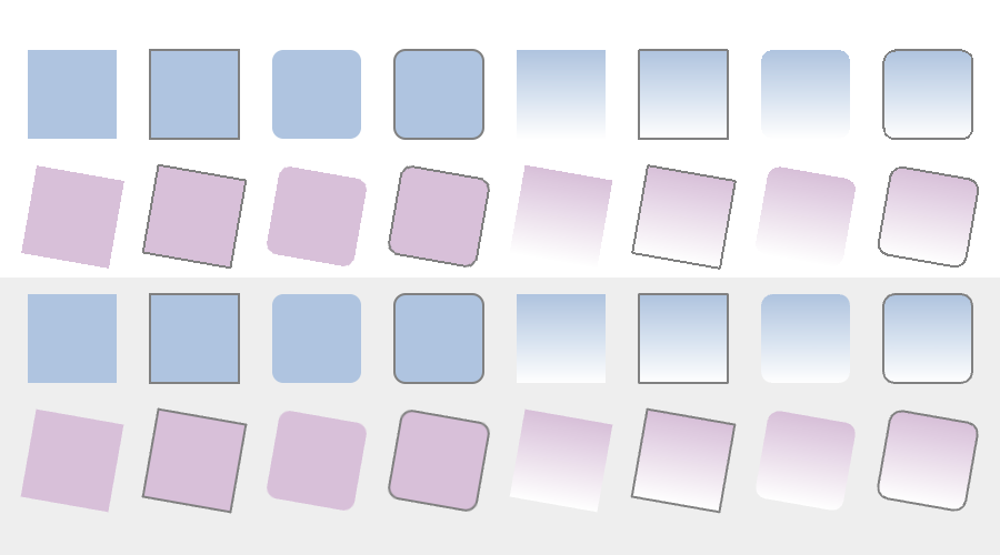 Rectangle { y: 0; width: 80; height: 80 color: "lightsteelblue" } Rectangle { y: 100; width: 80; height: 80 gradient: Gradient { GradientStop { position: 0.0; color: "lightsteelblue" } GradientStop { position: 1.0; color: "blue" } } } Rectangle { y: 200; width: 80; height: 80 rotation: 90 gradient: Gradient { GradientStop { position: 0.0; color: "lightsteelblue" } GradientStop { position: 1.0; color: "blue" } } }