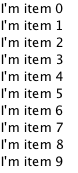 Column { Repeater { model: 10 Text { text: "I'm item " + index } } } |