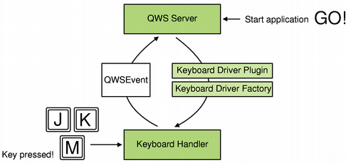 A keyboard driver receives keyboard events from the device and encapsulates each event with an instance of the QWSEvent class which it then passes to the server.