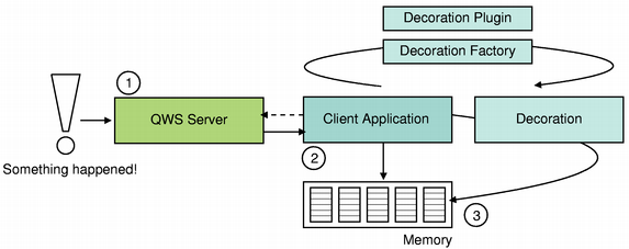 The decoration is loaded by the client application when it starts running (using Qt's plugin system), and can be customized by deriving from the QDecoration class and creating a decoration plugin. The default implementation of the QDecorationFactory class will automatically detect the plugin, loading the decoration into the application at runtime. Call the QApplication::qwsSetDecoration() function to actually apply the given decoration to an application.