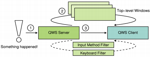 If an input method is installed, it is used as a filter between the server and the client application. Derive from the QWSInputMethod class to implement custom input methods, and use the server's setCurrentInputMethod() function to install it. In addition, it is possible to implement global, low-level filters on key events using the QWSServer::KeyboardFilter class; this can be used to implement things like advanced power management suspended from a button without having to filter for it in all applications.