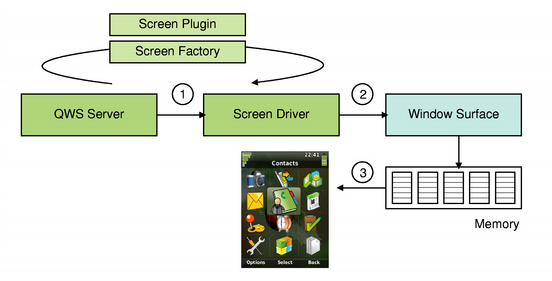 To locate the relevant parts of memory, the driver is provided with the list of top-level windows that intersect with the given region. Associated with each of the top-level windows there is an instance of the QWSWindowSurface class representing the drawing area of the window. The driver uses these objects to retrieve pointers to the various memory blocks. Finally, the screen driver composes the surface images before copying the updated region to the framebuffer.
