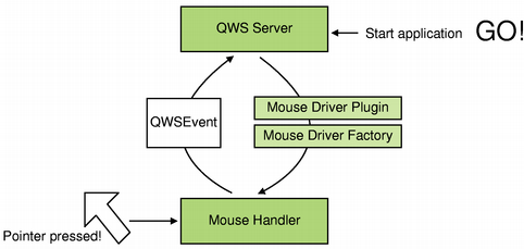 A mouse driver receives mouse events from the device and encapsulates each event with an instance of the QWSEvent class which it then passes to the server.