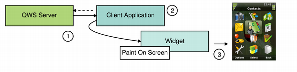 The running applications continuously alter the appearance of the screen by adding and removing widgets. The server maintains information about each top-level window in a corresponding QWSWindow object.