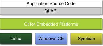 | Qt for Embedded Linux is designed to be used on Linux devices without X11 or existing graphical environments. This flavor of Qt includes a framework for creating both applications and an environment for them. As a result, it includes features for window management, inter-process communication and facilities for handling input and display devices. | Qt for Windows CE is used to create applications running in existing Windows CE and Windows Mobile environments. Applications use the appropriate style for the embedded environment and use native features, such as menus, to conform to the native style guidelines. | Qt for the Symbian platform is used to create applications running in existing Symbian platform environments. Applications use the appropriate style for the embedded environment and use native features, such as menus, to conform to the native style guidelines. |