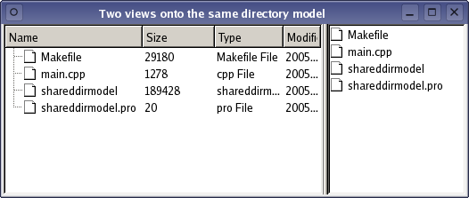 In this example, we display the contents of a model using two different views, and share the user's selection between them. We will use the QFileSystemModel supplied with Qt because it requires very little configuration, and provides existing data to the views.