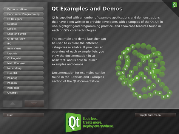 The Examples and Demos Launcher (qtdemo) allows the user to browse the examples and demonstrations included with Qt, access the documentation associated with each of them, and launch them as separate applications.