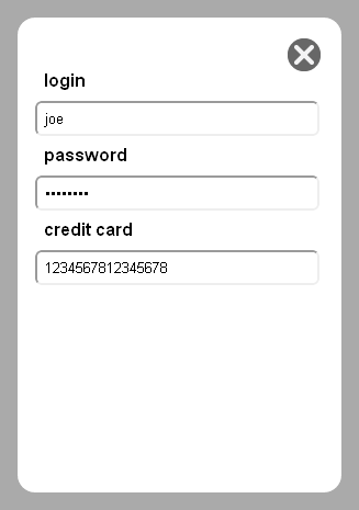The following displays simple storage functionality. The application prompts for a login and password if they are unavailable. This locally stored data is available the next time users open the browser. However, the contents of the credit card field is stored only for the duration of the browing session.