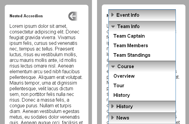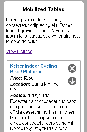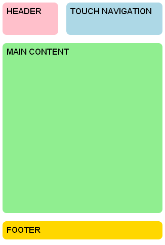 The following example shows a skeletal interface that appears differently based on the type of browser viewing it. The image below shows how it appears when viewed on a touch-based browser, but a desktop browser renders a more elaborate three-column layout: