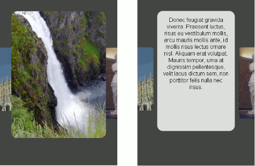 A separate sequence of transitions activates when users tap selected images. The first transition uses a scaleX transform to flip the image towards the center. The second then flips out a panel featuring details on the photo. When users navigate away to adjacent photos, the panel automatically flips back to its original state as it is moved to the side.