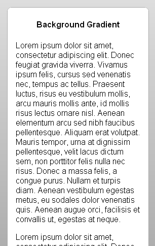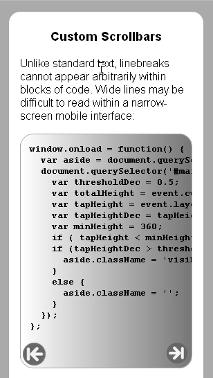 This section features links to numerous sample pages that demonstrate how various CSS3 features may be applied within a mobile interface. For best results, view these samples with a modern Webkit-based browser such as Apple Safari or Google Chrome. Resize the window in which the sample appears to roughly match the dimensions of a touch-screen mobile device.