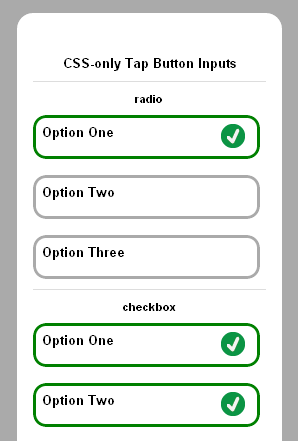 The following example provides alternate styling for radio and checkbox inputs, presenting them as tappable buttons: