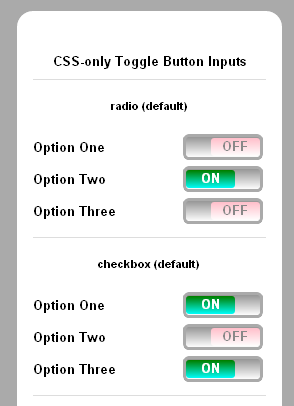 The example also relies on the -webkit-appearance property, which allows you to override the default visual presentation of specialized interface elements such as radio and checkbox inputs.