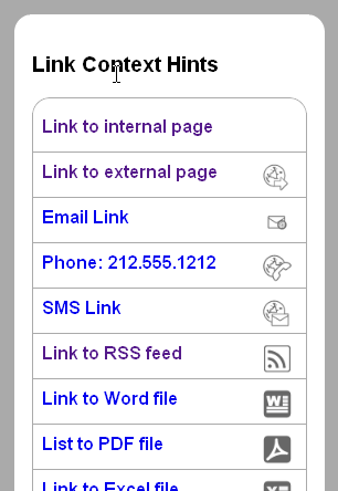 It is often useful to offer visual hints marking different kinds of link. Users might want to know the difference between a link to a page on the same website and one on an external site. Links to non-HTML file types might pose special challenges to mobile users. Alternately, mobile users might get special benefit from telephone links.