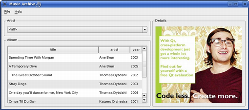 The Master Detail Example shows how to present data from different data sources in the same application. The album titles, and the corresponding artists and release dates, are kept in a database, while each album's tracks are stored in an XML file.