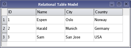 The Relational Table Model example shows how to use table views with a relational model to visualize the relations between items in a database.