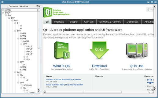 The DOM Traversal example shows how to use the QWebElement class to access the structure of a Web page.