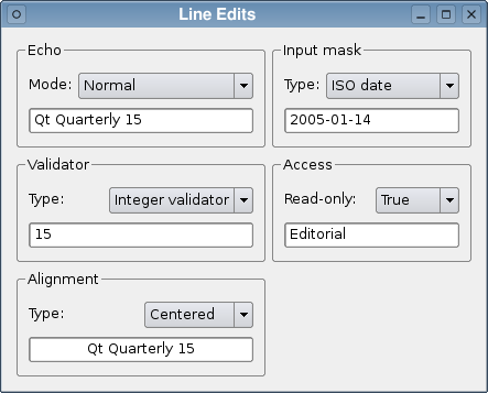 The Line Edits example demonstrates the many ways that QLineEdit can be used, and shows the effects of various properties and validators on the input and output supplied by the user.