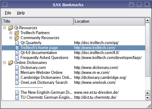 The SAX Bookmarks example provides a reader for XML Bookmark Exchange Language (XBEL) files that uses Qt's SAX-based API to read and parse the files. The DOM Bookmarks example provides an alternative way to read this type of file.