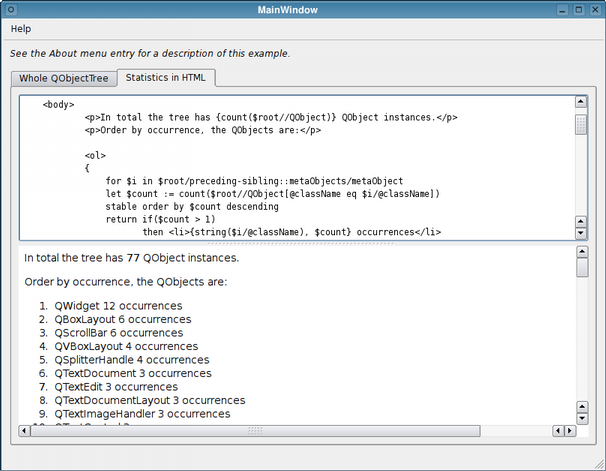 The first half of the function is an example of the standard code pattern for using QtXmlPatterns to run an XQuery. First it creates an instance of QXmlQuery. Then it binds the XQuery variable $root to the root node of the of the node model; i.e., the root of the QObject tree. Then it sets the query to be an XQuery that returns all the QObjects in the node model. Finally, the query is evaluated into a result item list.